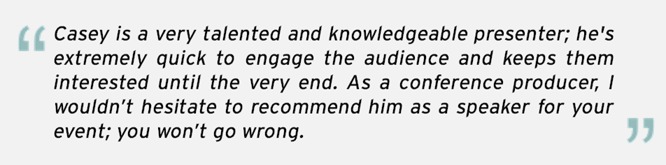 I would love to explore an opportunity to speak at your event. If you are interested in booking me for an event, please drop me a note via the Contact page, connect with me via LinkedIn, or direct message/mention me on Twitter @caseycarey.